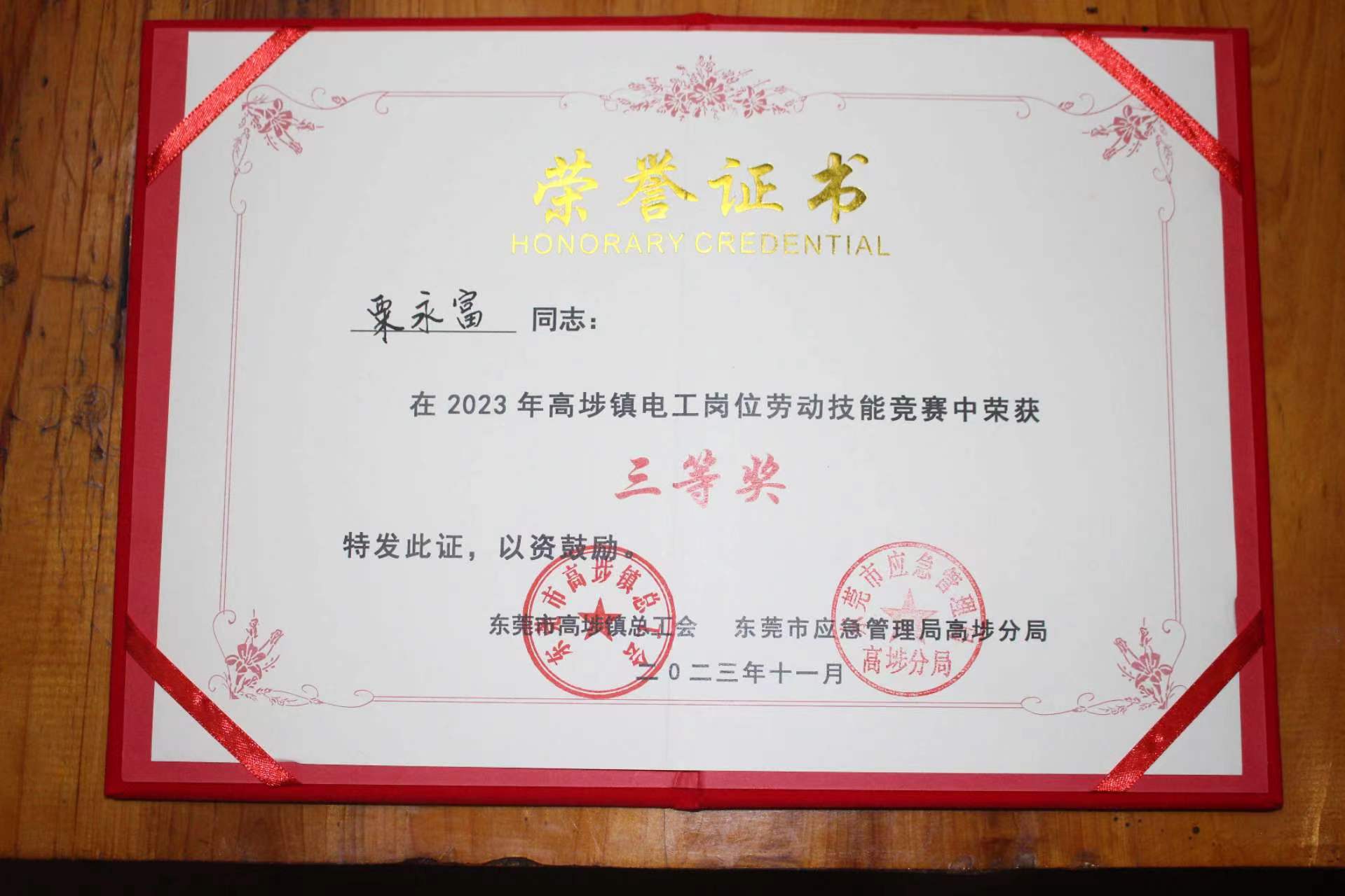 “高埗鎮(zhèn)電工技能競(jìng)賽三等獎(jiǎng)”
