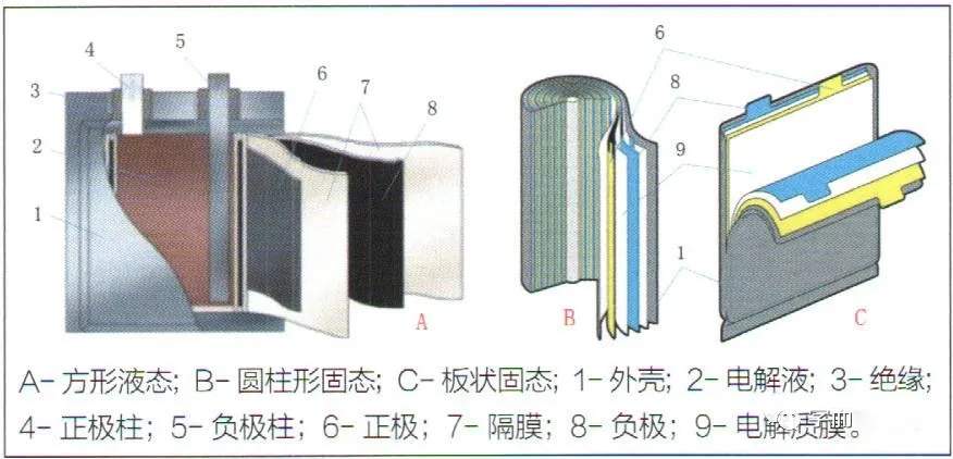 單體電池的形狀有方形、圓柱形、板狀等,如圖2所示。方形又分方形疊片式、方形卷繞式;圓柱形又分圓柱疊片式、圓柱卷繞式。包裝類型有硬包、軟包,硬包使用鋼殼、鋁殼,軟包使用鋁塑。