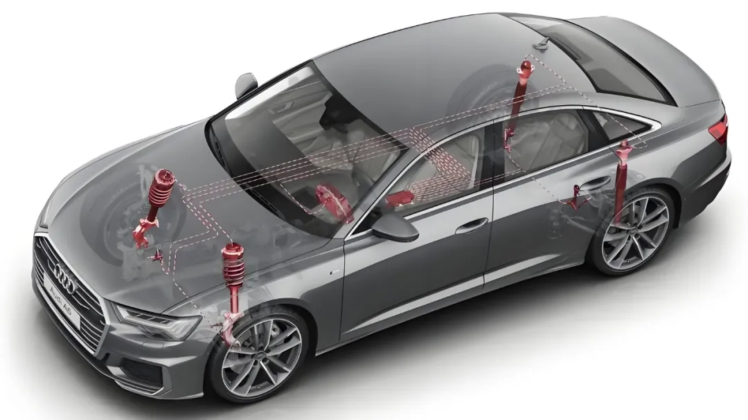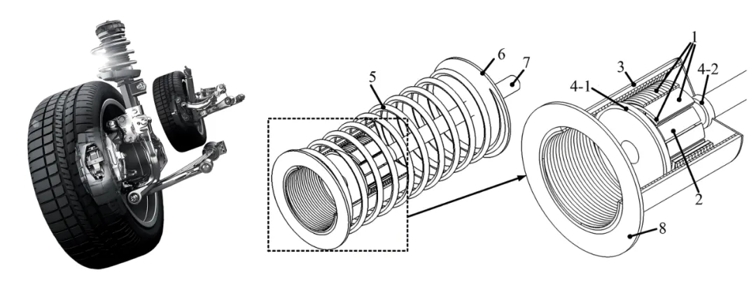 2016年,奧迪公司推出了電磁式主動懸架系統(tǒng)“eROT”,示意圖如下。該系統(tǒng)在城市道路工況下的能耗約為40至60瓦,而在高速公路上則降至10至20瓦。橡膠硅膠材料的密封系數(shù)