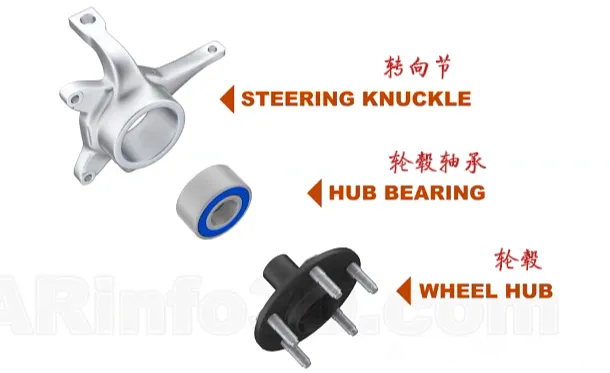 整個(gè)輪轂總成由輪轂、輪轂軸承、轉(zhuǎn)向節(jié)組成,三者相連接后,再通過轉(zhuǎn)向節(jié)與控制臂相連。