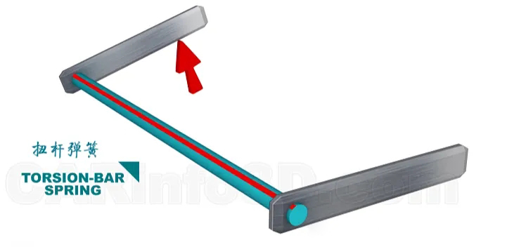 扭桿彈簧是一根可以扭轉(zhuǎn)的金屬棒,使用時(shí)一端固定在車架上,另外一端與控制臂相連,當(dāng)車輪經(jīng)過障礙物后,扭桿彈簧儲(chǔ)存的彈性勢(shì)能使控制臂和車輪迅速回位。