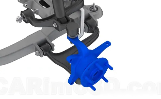 轉(zhuǎn)向節(jié)除與控制臂連接,還與橫拉桿相連,此外,制動(dòng)鉗(紅色)也是安裝在轉(zhuǎn)向節(jié)上的。