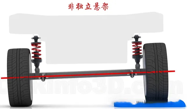 非獨(dú)立懸架,顧名思義,其左右兩側(cè)車輪通過一根剛性軸相連,一側(cè)車輪的起伏會(huì)直接影響另一側(cè),導(dǎo)致車身晃動(dòng)明顯,多見于貨車、客車及部分SUV。