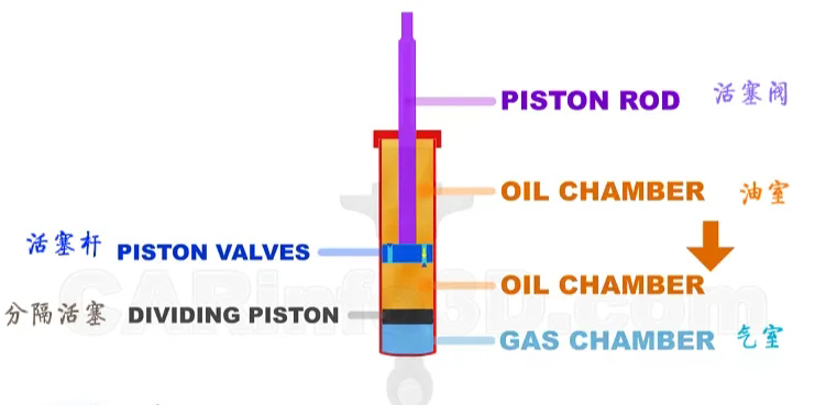 減震器由活塞閥、油室、活塞桿、分隔活塞和氣室構(gòu)成。