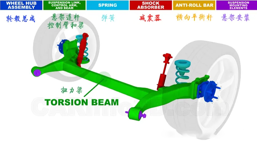 在半獨(dú)立懸架系統(tǒng)中,傳遞力的部件則主要是扭力梁。