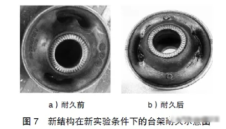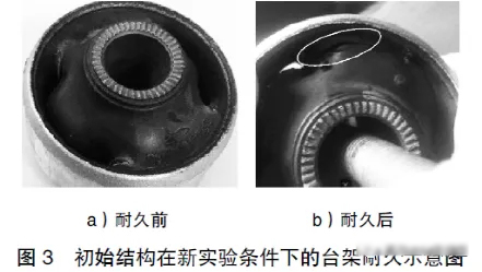 為驗證新設(shè)計的有效性,團(tuán)隊在實(shí)驗室MTS多通道試驗臺架上進(jìn)行了耐久疲勞試驗。結(jié)果顯示,新結(jié)構(gòu)襯套在V2方向交變60萬次、V1方向交變13萬次后,均未出現(xiàn)裂紋,證明了其疲勞耐久性能的顯著提升。