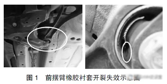 某型號汽車的控制臂橡膠襯套在通過靜態(tài)、動態(tài)剛度及臺架耐久測試后,于整車強(qiáng)化路試階段,行駛約5000公里時,兩件襯套均出現(xiàn)開裂現(xiàn)象,導(dǎo)致失效。