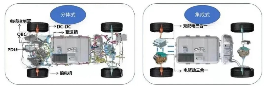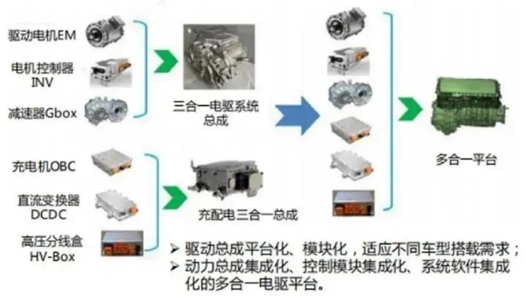 多合一將逐漸代替三合一:未來,除電機、電機控制器、減速器外,高壓分線盒、DC/DC、充電機OBC等部件也可能集成進動力總成系統(tǒng),形成功能更全的多合一系統(tǒng)。