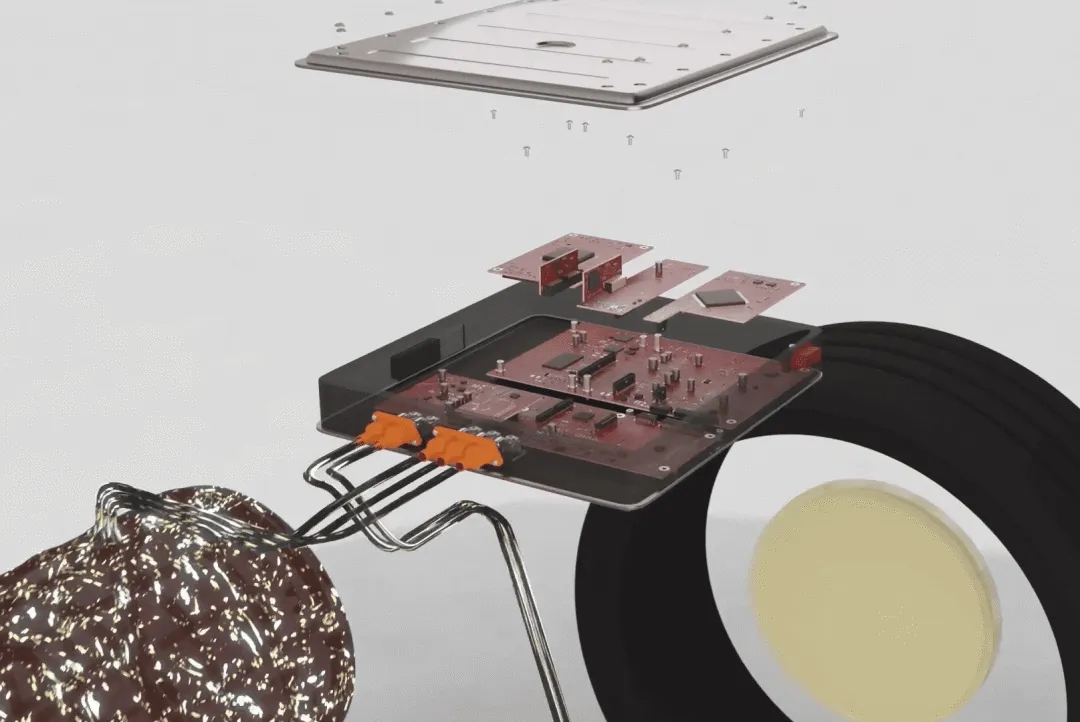 汽車逆變器中內(nèi)部單元的圖示示例,顯示了多個PCB配置中的各種組件連接