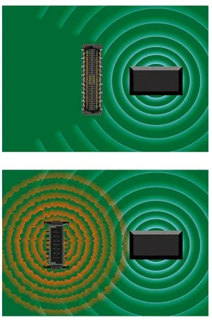 一個屏蔽連接器(上)和兩個非屏蔽連接器(下)的比較。屏蔽選項不僅可以防止來自附近連接器的干擾,還可以防止其自身的信號干擾周圍的連接
