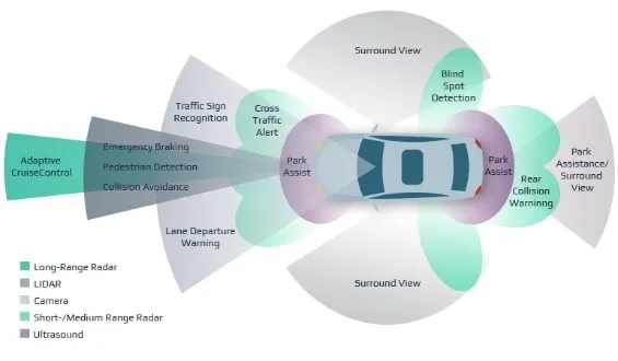 “視覺”數(shù)量示例,包括重疊的攝像頭、雷達、激光雷達和超聲波傳感器,這些傳感器必須在車輛系統(tǒng)內(nèi)緊密運行,以傳輸信息和計算戰(zhàn)略反應(yīng)