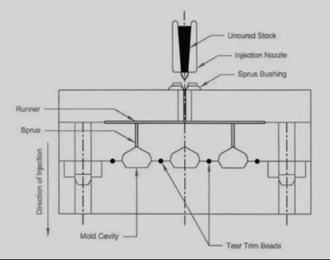 在高溫高壓下,橡膠通過流道系統(tǒng)進入型腔。