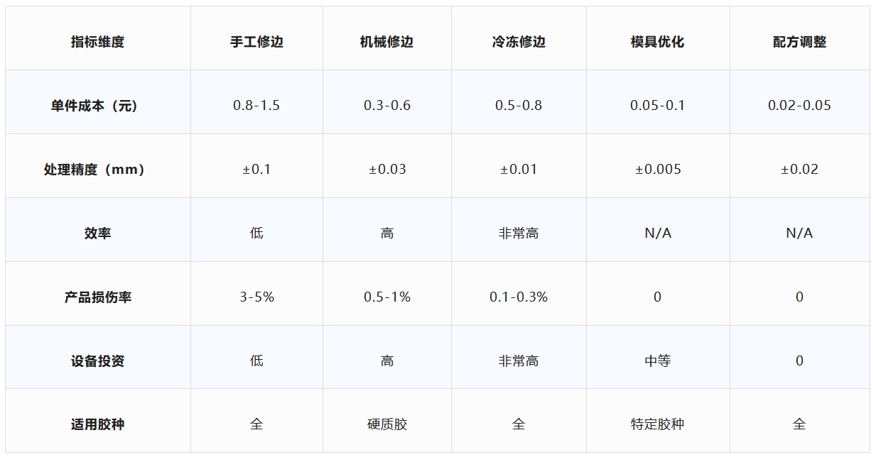 常規(guī)制品:采用“精密模具(間隙≤0.01mm)+冷凍修邊(-150℃×10min)”組合方案,可實(shí)現(xiàn)單件綜合成本0.3-0.5元,滿足汽車行業(yè)≤0.05mm飛邊標(biāo)準(zhǔn)。