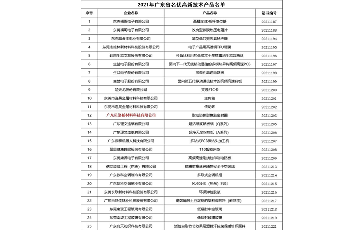 貝洛新材入選2021年廣東省名優(yōu)高新技術(shù)產(chǎn)品名單
