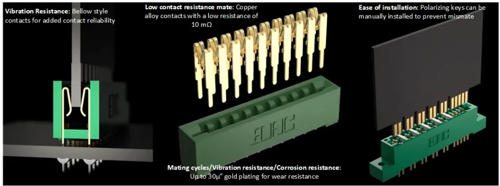 圖 2.卡邊緣連接器采用波紋管式觸頭,具有抗振性,銅合金觸頭具有低電阻,鍍金具有耐磨性。(圖片:ConnectorSupplier)