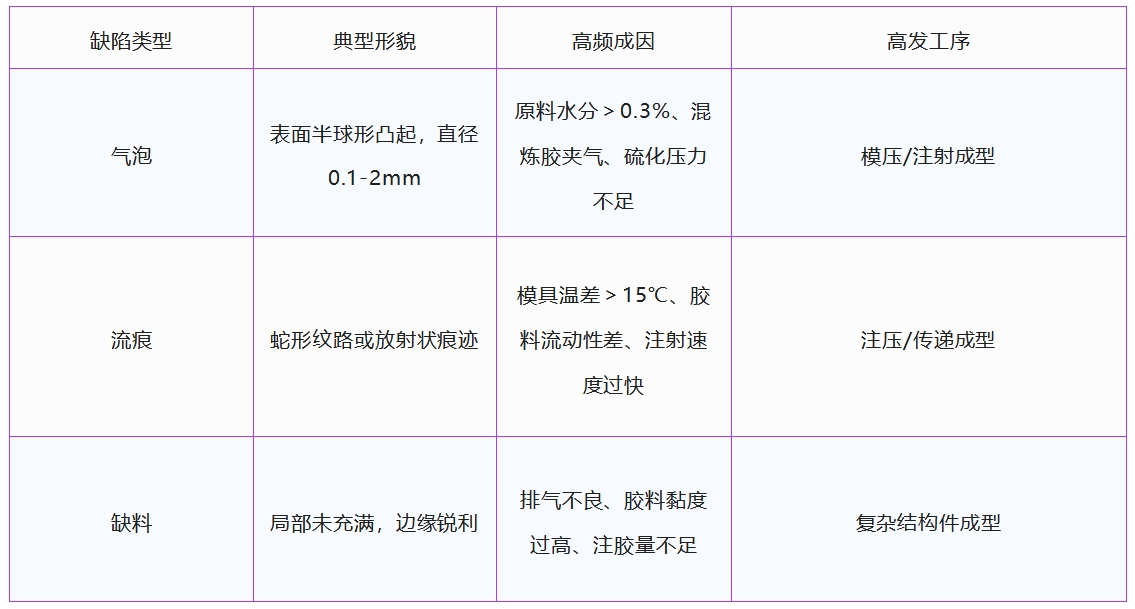 橡膠制品的外觀質(zhì)量不僅決定了產(chǎn)品的等級(jí),還直接影響客戶的滿意度以及后續(xù)的性能表現(xiàn)。本文針對(duì)研發(fā)、質(zhì)量、質(zhì)檢及生產(chǎn)人員,系統(tǒng)性地分析了橡膠制品表面常見(jiàn)的三大缺陷——氣泡、流痕、缺料的成因,并提供了詳細(xì)的應(yīng)對(duì)策略和技術(shù)參數(shù),以便在生產(chǎn)現(xiàn)場(chǎng)參考和執(zhí)行。汽車連接器精密硅橡膠配件