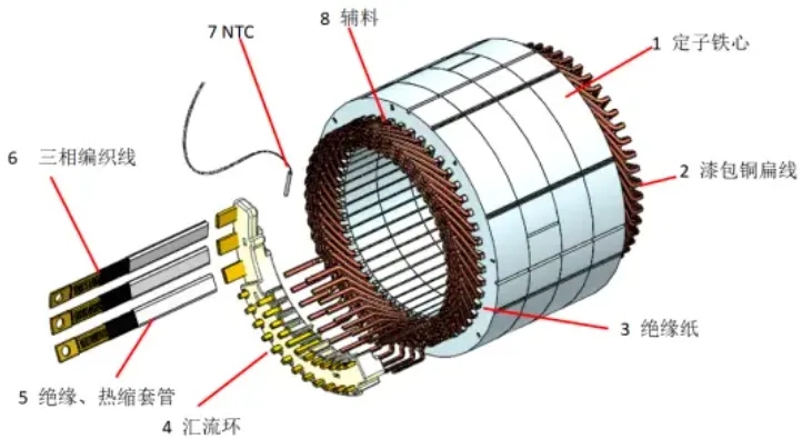 扁線電機:采用矩形截面的銅線繞組,提升槽滿率約30%,實現(xiàn)更高功率密度和效率,已廣泛應用于比亞迪、大眾、特斯拉等品牌車型;