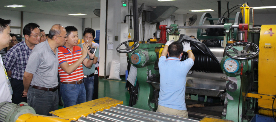 在董事長蘇會敏的帶領(lǐng)下,領(lǐng)導(dǎo)們首先來到公司會議室,聽取了針對公司近年來發(fā)展?fàn)顩r、發(fā)展方向和投資等情況的詳細(xì)介紹。介紹完后,一行領(lǐng)導(dǎo)先后來到工程試驗(yàn)研發(fā)中心、硫化成型、開煉等區(qū)域進(jìn)行現(xiàn)場參觀。在參觀過程中,制造總監(jiān)蘇方云先生向領(lǐng)導(dǎo)們詳細(xì)介紹了產(chǎn)品原料、生產(chǎn)工藝流程、質(zhì)檢流程等。