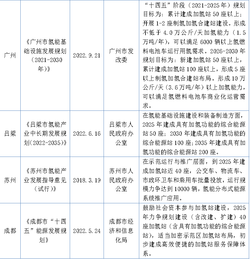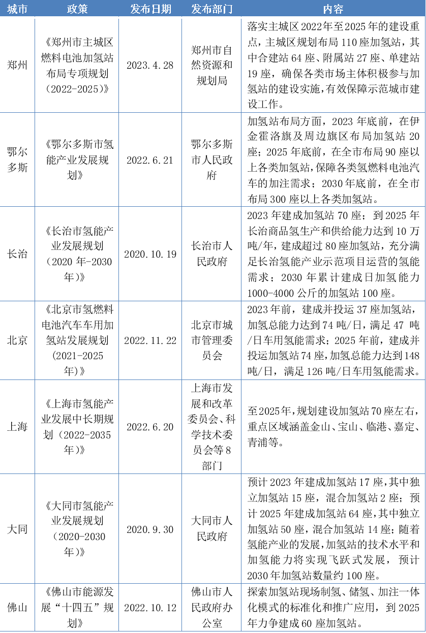 表 1:2025年加氫站規(guī)劃數(shù)量TOP10城市出臺(tái)政策詳情