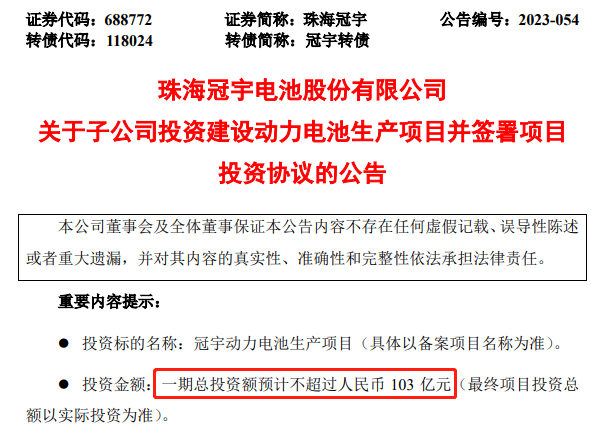 5月22日,珠海冠宇(688772.SH)也發(fā)布了大規(guī)模投建公告。珠海冠宇宣布,公司控股子公司浙江冠宇擬在四川省德陽市設(shè)立項(xiàng)目公司投資建設(shè)動(dòng)力電池,一期總投資額不超過103億元,投產(chǎn)后產(chǎn)能達(dá)25GWh。力爭半年內(nèi)開工建設(shè),開工后42個(gè)月內(nèi)全部建成投產(chǎn)。