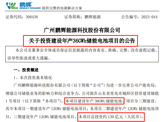 5月22日,鵬輝能源(300438.SZ)公告稱,公司擬在山東青島市城陽區(qū)投資建設(shè)儲(chǔ)能1號(hào)項(xiàng)目,項(xiàng)目建設(shè)年產(chǎn)36GWh儲(chǔ)能電池。該項(xiàng)目分三期建設(shè),每期建設(shè)年產(chǎn)12GWh儲(chǔ)能電池項(xiàng)目,項(xiàng)目總投資約130億元。項(xiàng)目一期計(jì)劃于今年9月底前開工建設(shè),于2024年12月底前建成投產(chǎn)。