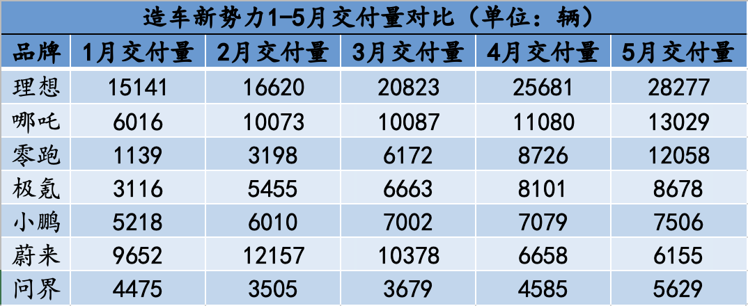 如上圖所示,這是新勢(shì)力們公布出來(lái)的交付量,以及1-5月份每個(gè)月的交付量。
