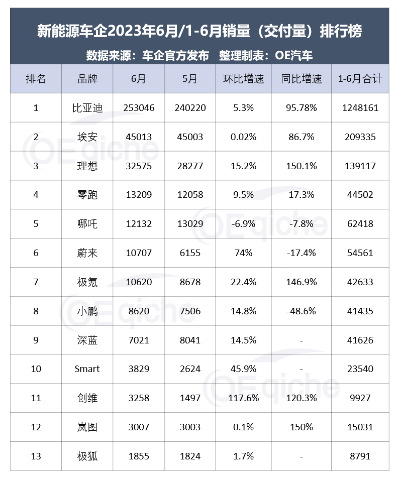 2023-07-04 09:07:157月伊始,各大新能源、新勢力品牌如期對外公布最新月度交付量。OE汽車根據(jù)車企官方公開的數(shù)據(jù),整理出主要新能源車企的銷量及交付量數(shù)據(jù)。