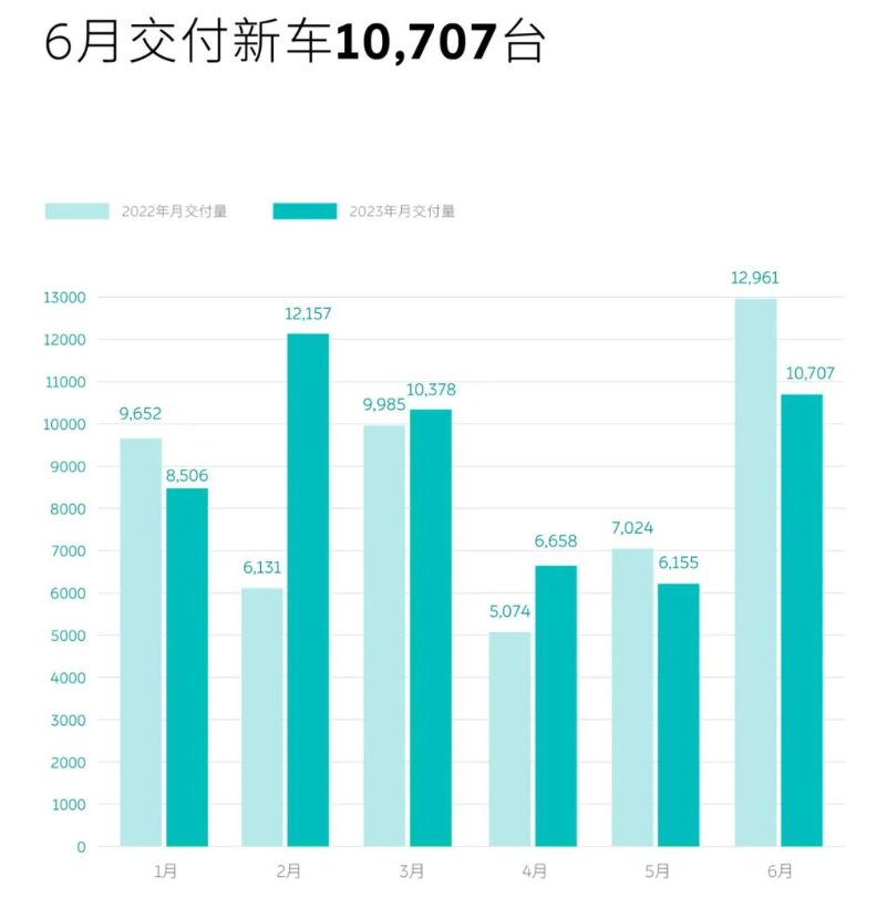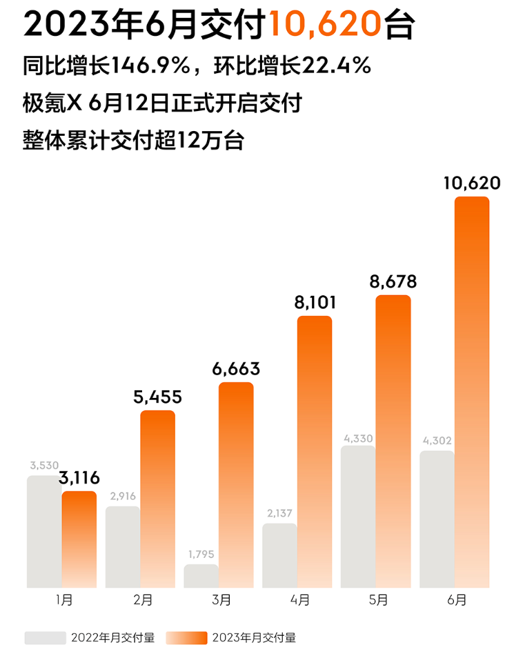 2023年6月交付10620臺,同比增長146.9%,環(huán)比增長22.4%,整體累計交付超12萬臺。