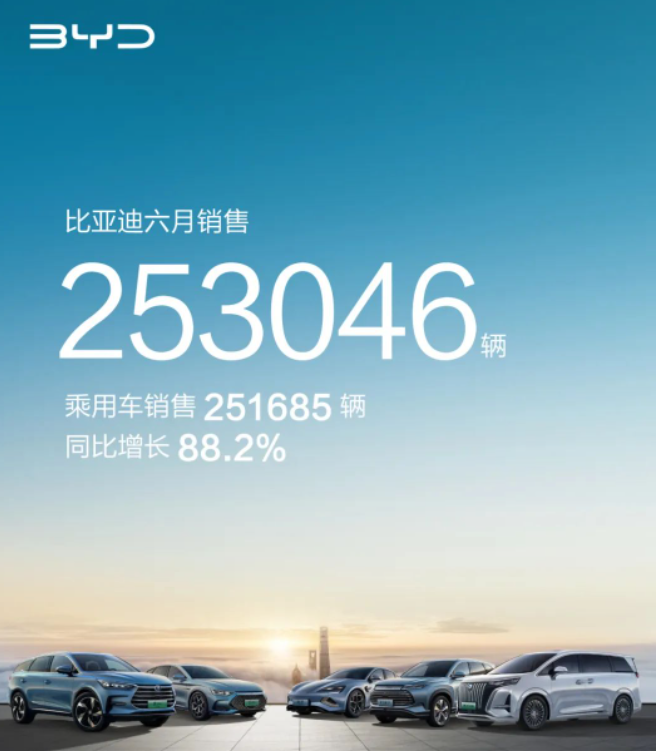 比亞迪一騎絕塵,6月新能源汽車銷量253046輛,今年上半年累計銷量約126萬輛,同比增長95.78%。