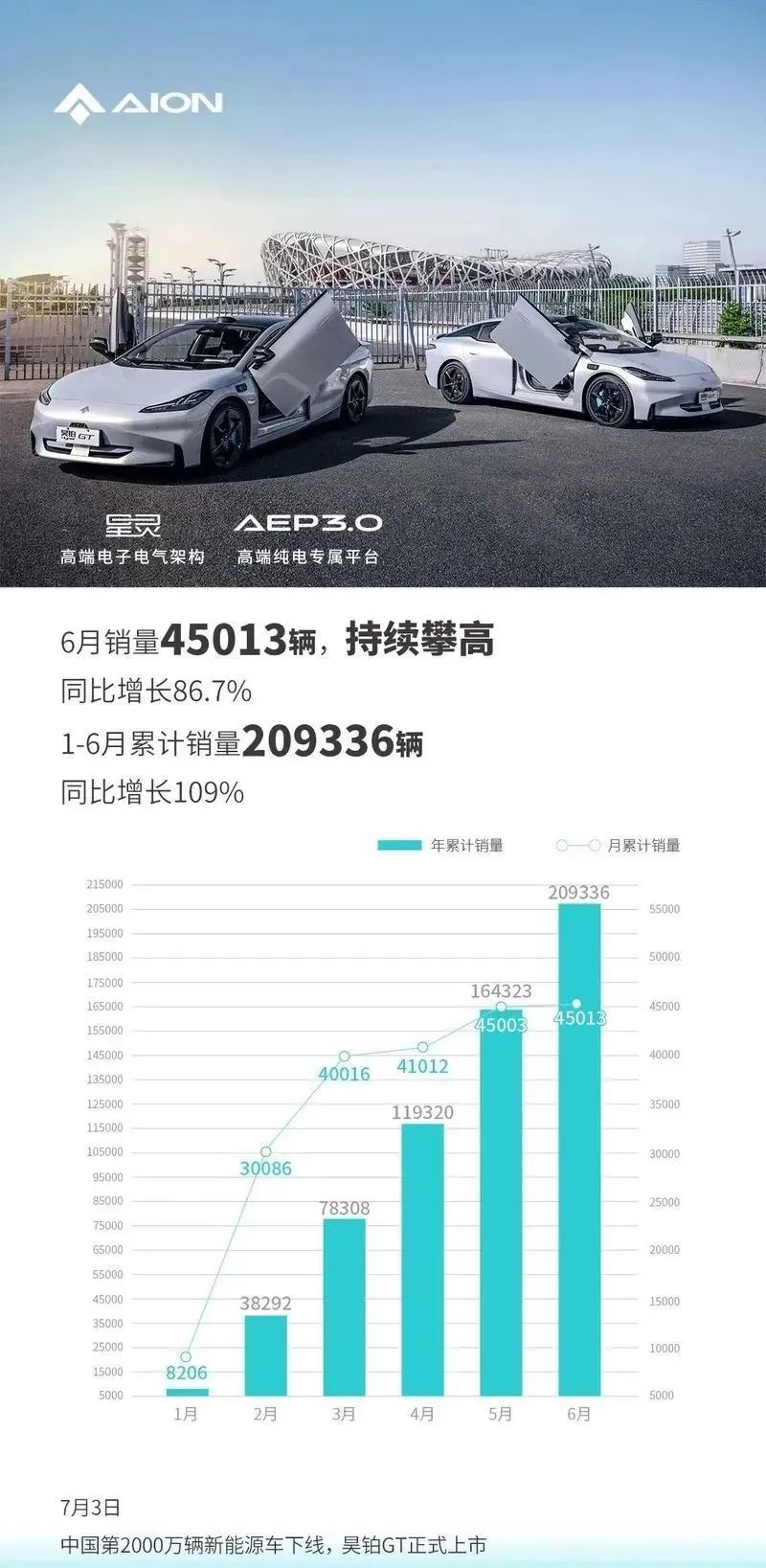 廣汽埃安公布最新銷量成績。2023年6月銷量45013輛,同比增長86.7%。2023年1-6月累計銷量209336輛,同比增長109%。