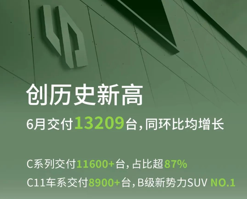 零跑汽車6月全系交付13,209輛,環(huán)比增長9.6%,同比增長17.3%。其中C系列交付11600+輛,占比超87%;C11車系交付8900+輛,位居B級新勢力SUV交付量NO.1。