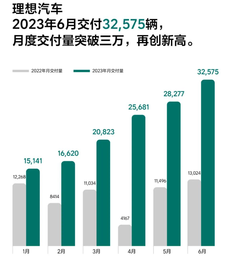 6月,理想共計交付新車32575輛,月度交付首次突破3萬輛,環(huán)比增長15.2%,同比增長150.1%,坐穩(wěn)新勢力銷冠位置。