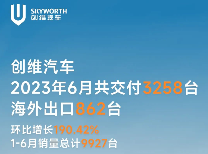 創(chuàng)維汽車6月共交付新車3,258輛,海外出口862輛,環(huán)比增長190.42%。1-6月銷量總計9,927輛,相對于今年全年4萬輛的目標,完成度為25%。